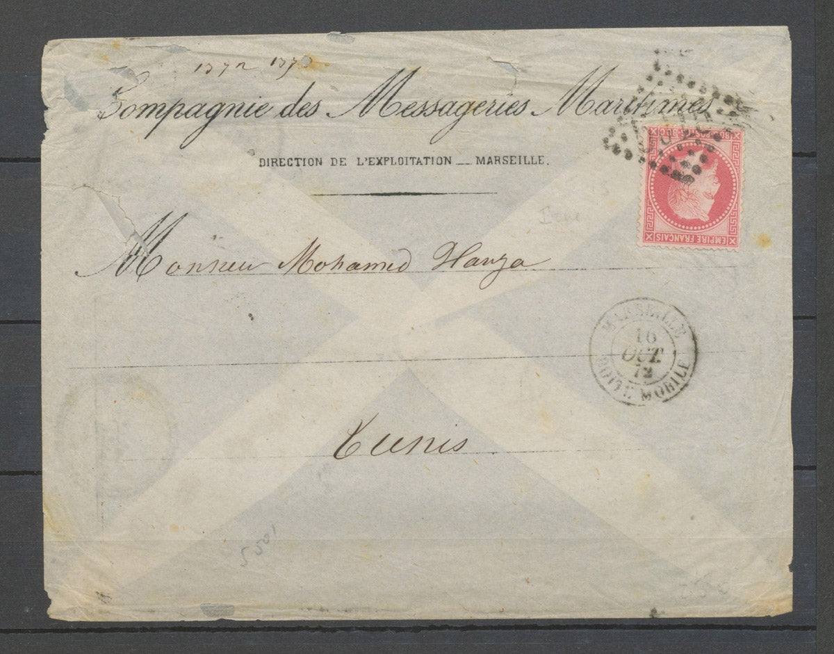 1872 Lettre de Marseille à Tunis à 80c (erreur) Càd Marseille/Boite Mobile X4054