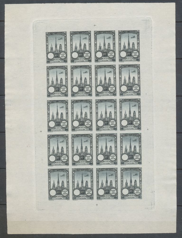 1922 Meeting a rien Rouen feuillet complet de 20 essais Neuf noir sur Gris clair non dentel . Sans la valeur dans le cartouche. Bloc neuf sans gomme ( mis ainsi). Cote plus de 400 .