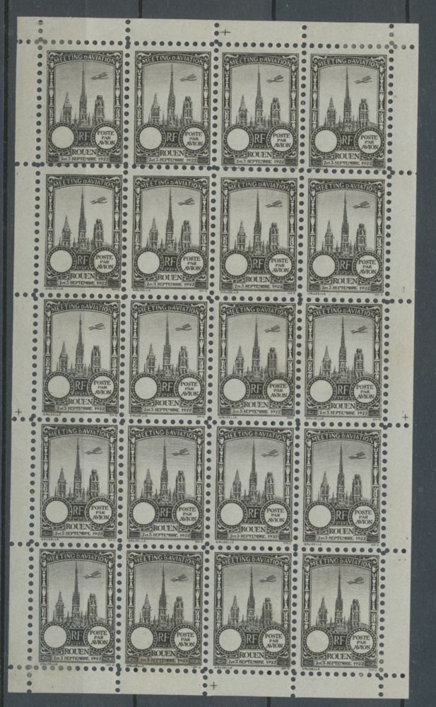 1922 Meeting a rien Rouen feuillet complet de 20 essais Neuf gris Noir. Sans la valeur dans le cartouche. Timbres neufs luxes et neufs * (4 timbres avec trace de charni res sur les coins de feuillet). Gomme de mauvaise qualit mais naturelle