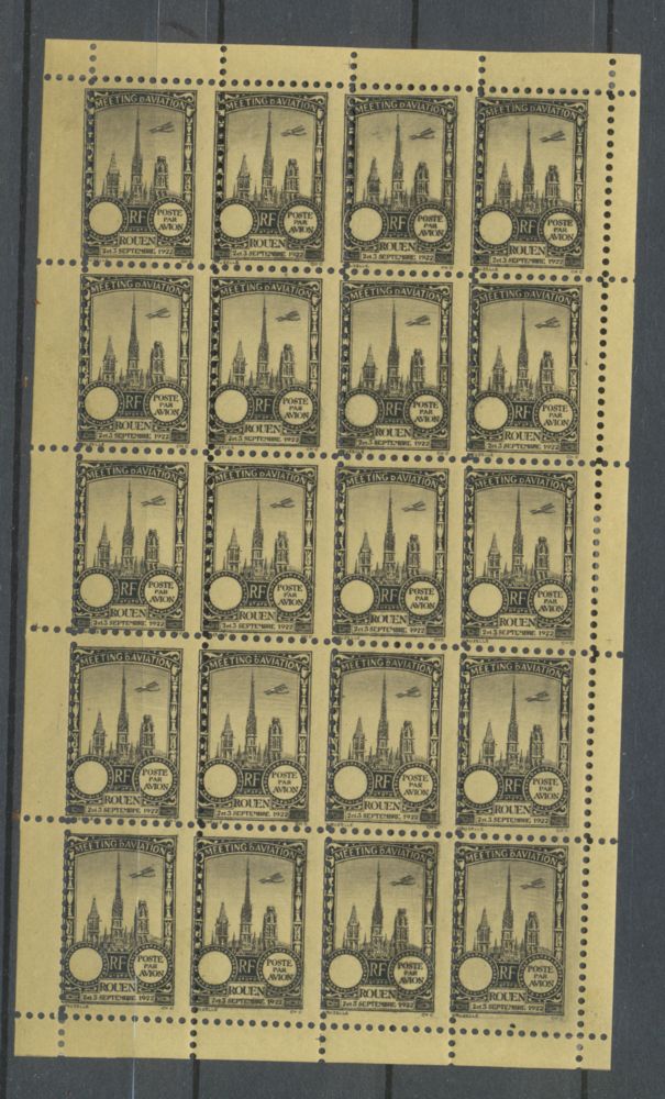 1922 Meeting a rien Rouen feuillet complet de 20 essais Neuf Jaune clair tirant sur gris. Sans la valeur dans le cartouche. Timbres neufs luxes et neufs * (6 timbres avec trace de charni res sur les coins de feuillet)