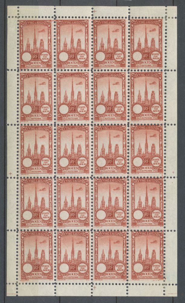 1922 Meeting a rien Rouen feuillet complet de 20 essais Neuf Rouge Carmin. Sans la valeur dans le cartouche. Timbres neufs luxes et neufs * (4 timbres avec trace de charni res sur les coins de feuillet)