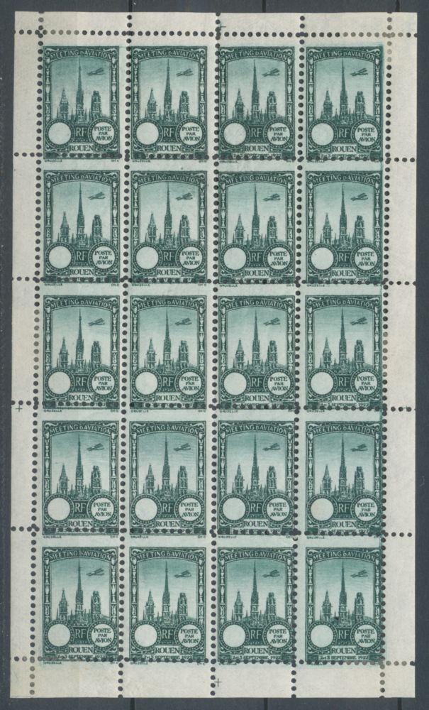 1922 Meeting a rien Rouen feuillet complet de 20 essais Neuf Vert fonc . Sans la valeur dans le cartouche. Timbres neufs luxes et neufs * (6 timbres avec trace de charni res sur les coins de feuillet)