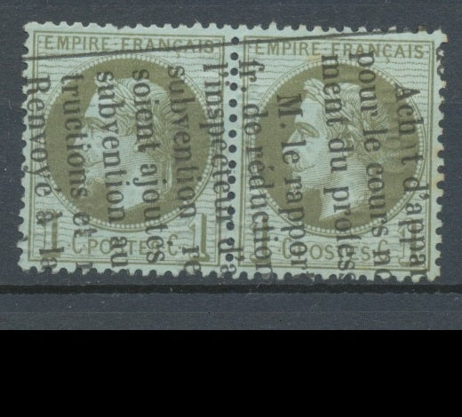1870 France Classique Paire N°25 1c olive oblitéré Annulation typographique des journaux.