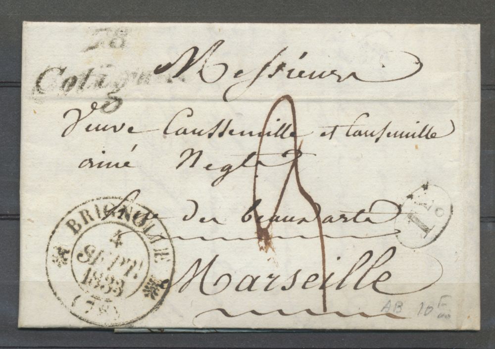 1833 Lettre Cursive 78 COTIGNAC + CAD T12 BRIGNOLLE (VAR) + 1d noir. Indice 15. TB