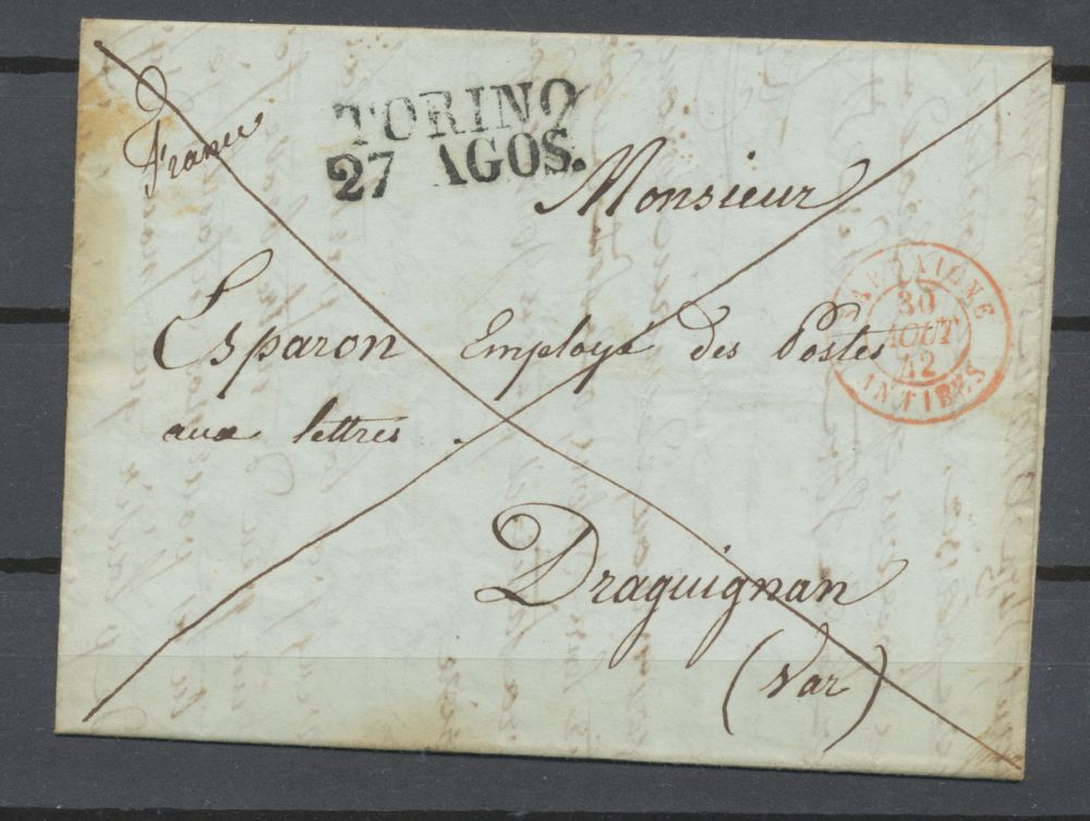 1842 Lettre de en PP Turin Marque TORINO .27 AGOS. CAD rouge entrée en France Sardaigne Antibes pour Draguignan Superbe.