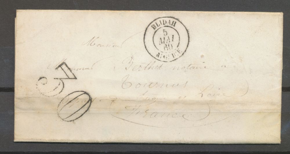 5 Mai 1860 Lettre avec correspondance Taxe 30c CAD BLIDAH ALGERIE Pour Tournus. TB.