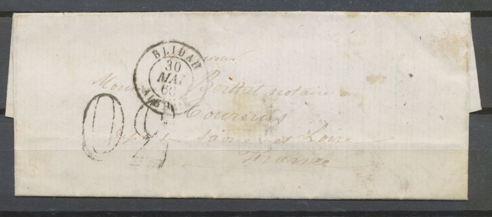 5 Mai 1860 Lettre avec correspondance Taxe 30c CAD BLIDAH ALGERIE Pour Tournus. TB.