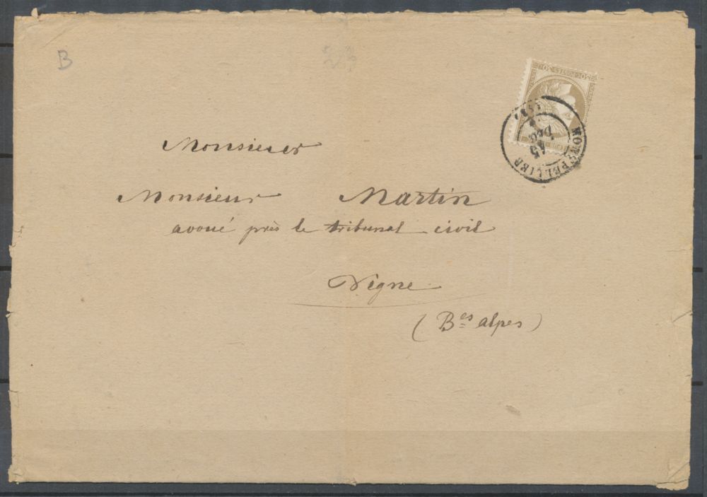 1875 Lettre N°56 30c Brun oblitéré CAD Montpellier. Grand papier plié en 4 sans texte.