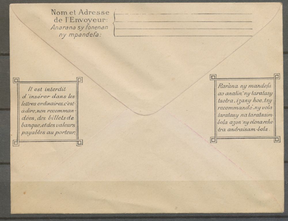 Madagascar Enveloppe Entier Postal 25c vert et noir. Enveloppe fermée, vide. TB